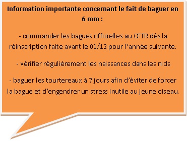 Des discussions ont eu lieu avec les  membres du CA du CFTR et le corps technique SNC lors de son dernier CA en date du 8 juillet qui ont jugé urgent ce changement afin que la France puisse proposer un dossier très sérieux dans l’objectif de rendre européenne en colombiculture la Tourterelle rieuse. De plus, le nouveau système de financement de l’aviculture française donne comme unique distributeur officiel de bagues colombicoles la Société Nationale de Colombiculture : dès 2018, toutes les bagues distribuées pour les Tourterelles rieuses seront donc en diamètre 6 mm. Le 6.5 mm n’est plus prévu en colombiculture, aucune commande de ce diamètre ne sera donc réalisée !
