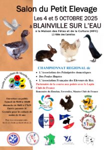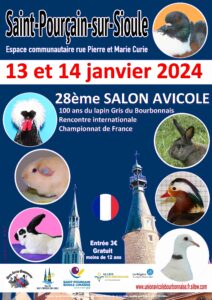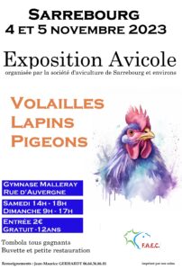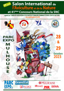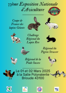 Championnat de France du Strasser, Strasser de Moravie et Dragon. Coupe de France de la Wyandotte. Championnat régional lapins Argenté, pigeon de couleur. Challenge des jeunes éleveurs. Inscription en ligne sur https://expositions-aviculture.fr Enlogement vendredi après-midi et délogement dimanche à 14h.