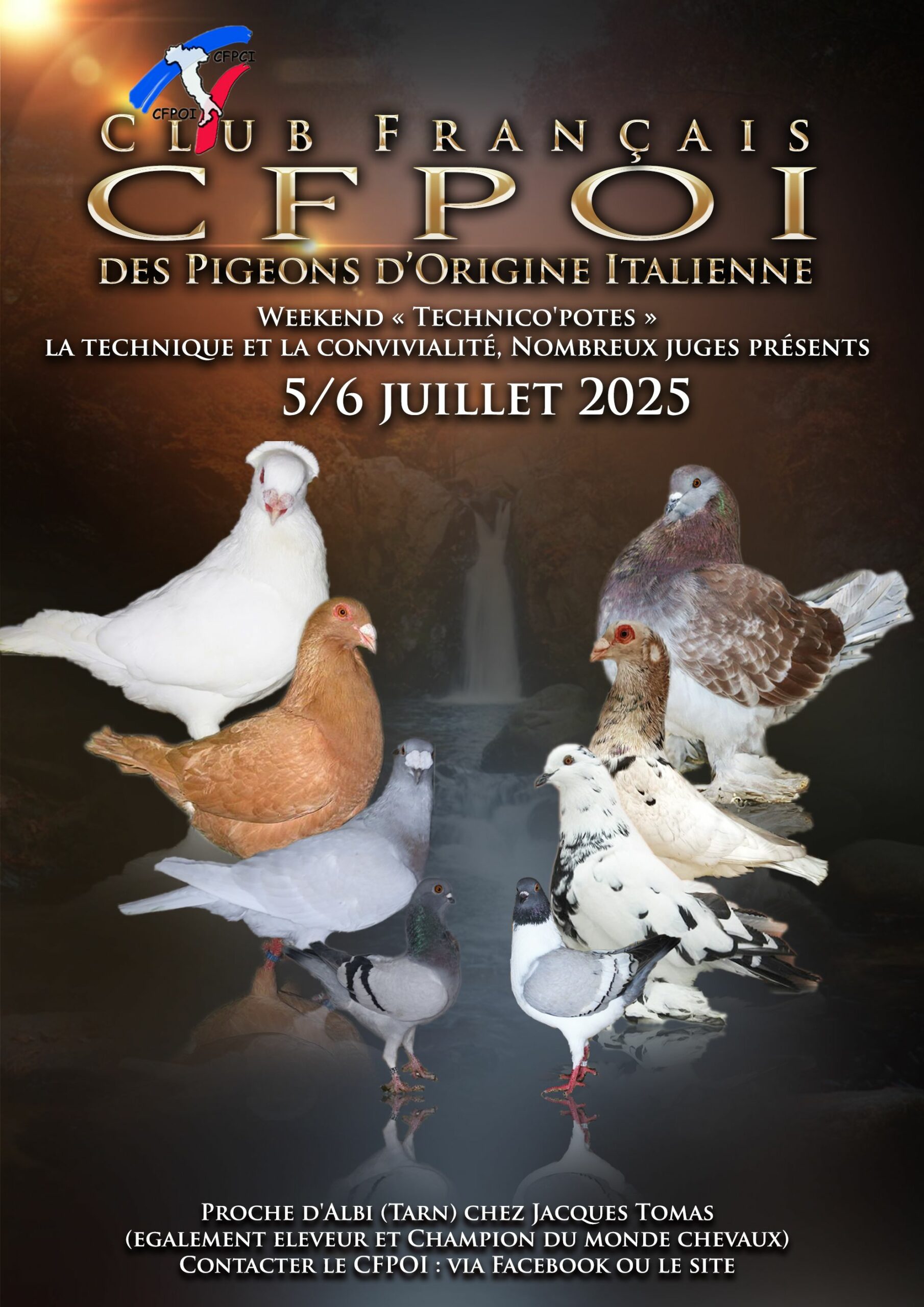 le Club Français des pigeons d’origine italienne (CFPOI) et le Club Français du pigeon Cravaté Italien (CFPCI) organisent les 5/6 Juillet 2025, dans le Tarn un week-end « Technico’Potes » , deux journées techniques, comme son nom l’indique, dans la convivialité, et avec la technique. De nombreux juges doivent etre présents, et avec les éleveurs référents des presentations seront faites, des simulations ludiques de jugement, etc …