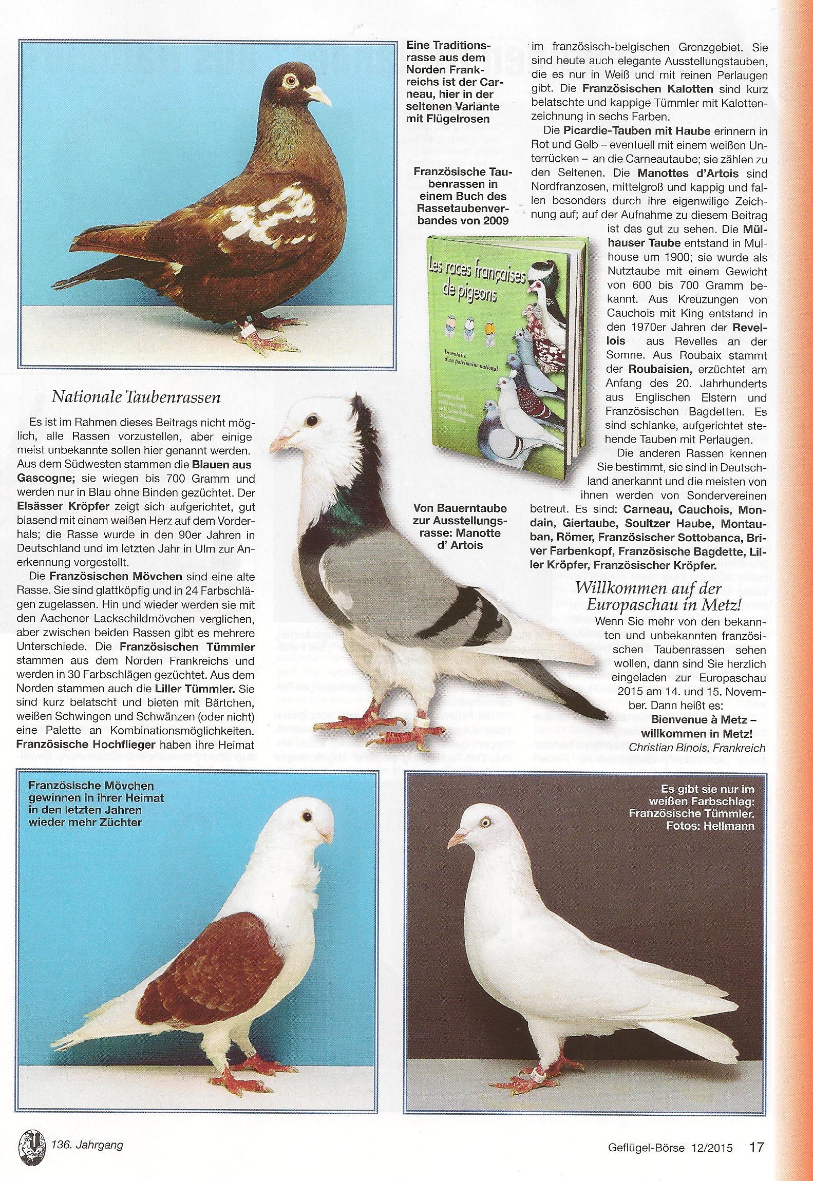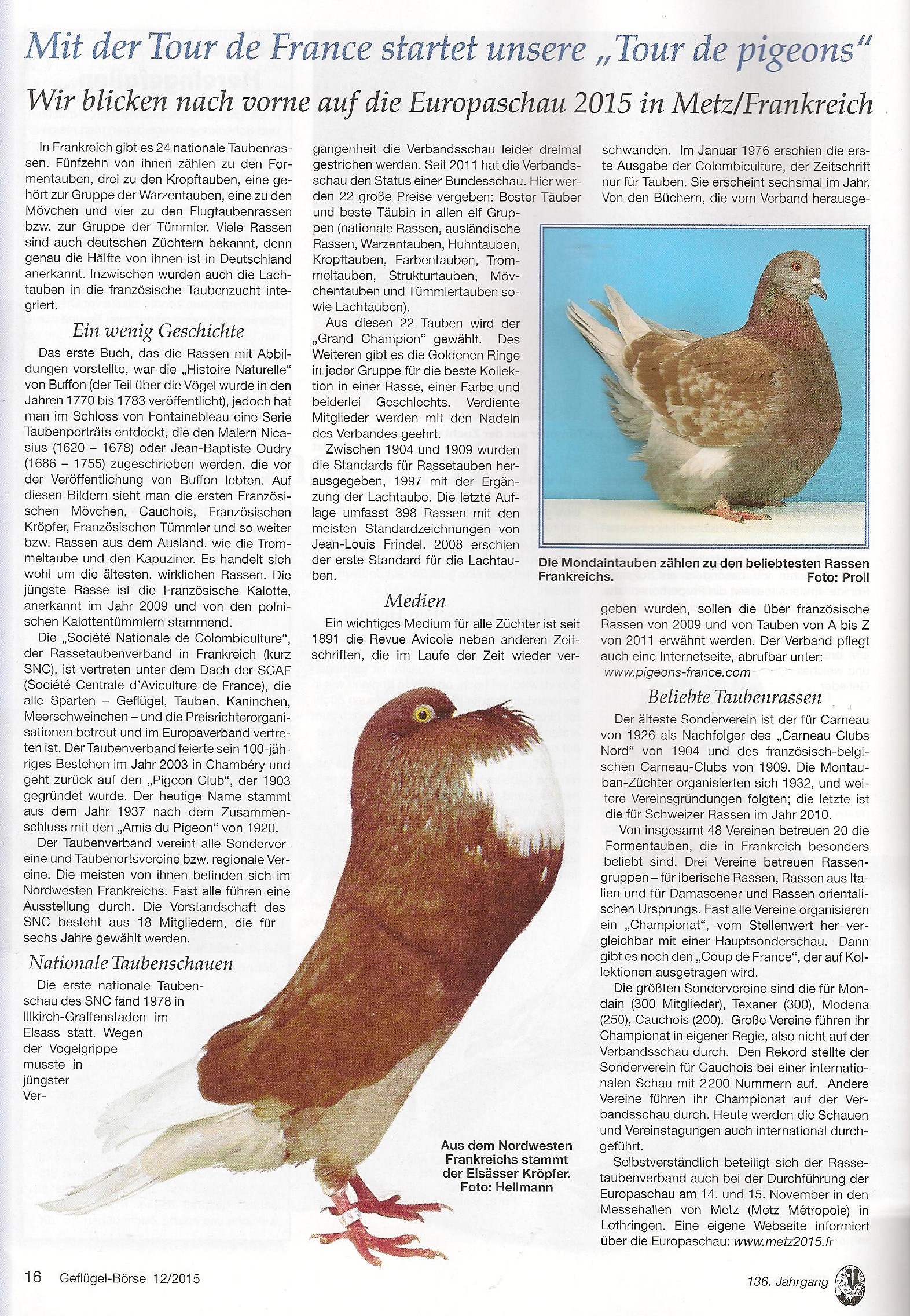 Geflügel Börse est un des deux magazines avicoles les plus distribués en Allemagne et chez les lecteurs de langue allemande. Dans le numéro 12 de cette année, un article met en valeur la colombiculture française et la prochaine Exposition européenne de Metz. Le texte transmis par Christian Binois a été adapté et traduit par le rédacteur en chef de la partie « pigeons » de la revue, Remco de Koster.